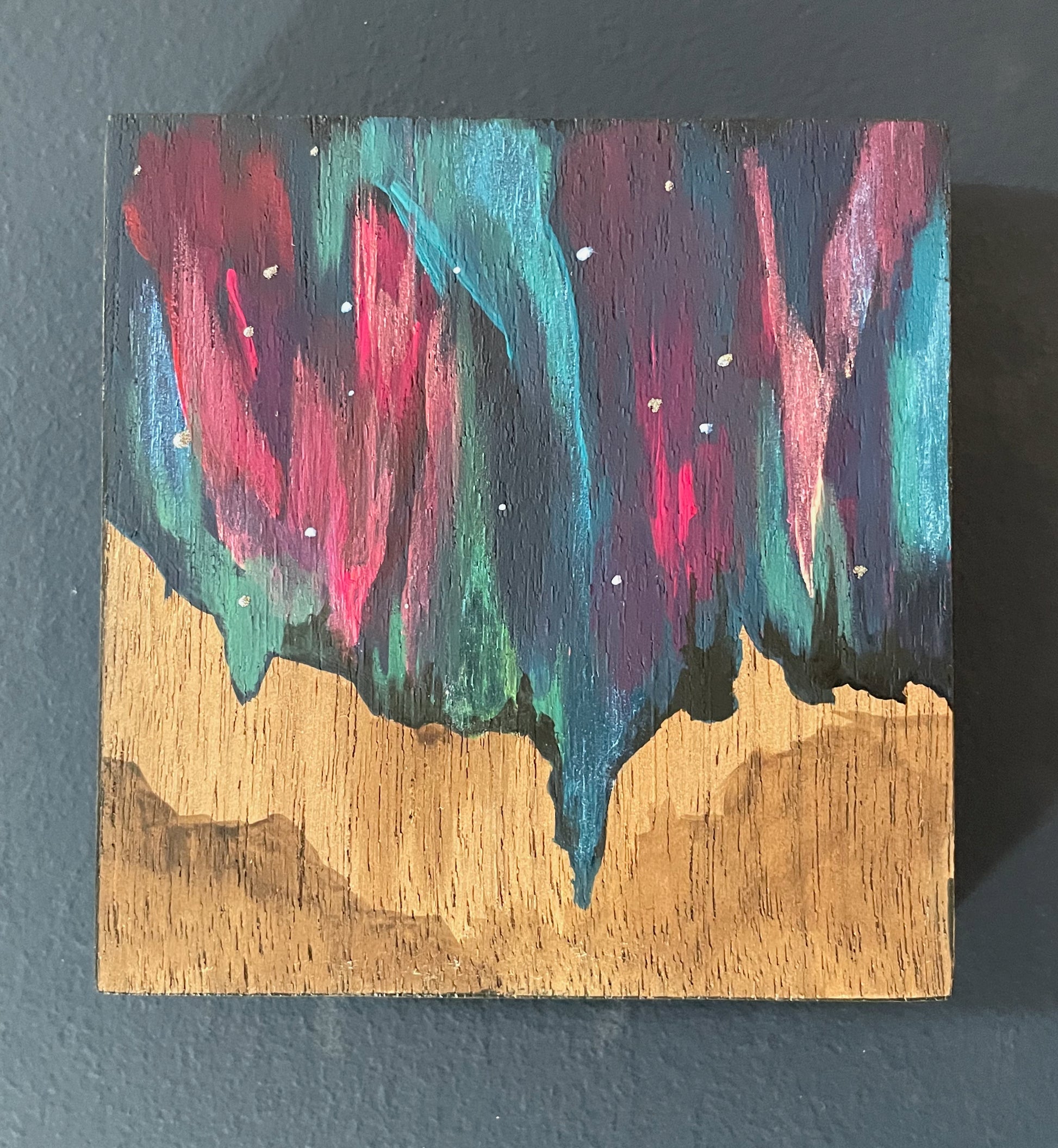 This 4x4 original mini painting captures the quiet magic of the northern lights drifting across a deep, star-filled sky. Hand-painted on solid walnut wood, the natural grain shines through the layers of color, giving the piece an earthy, grounded glow beneath the celestial scene.